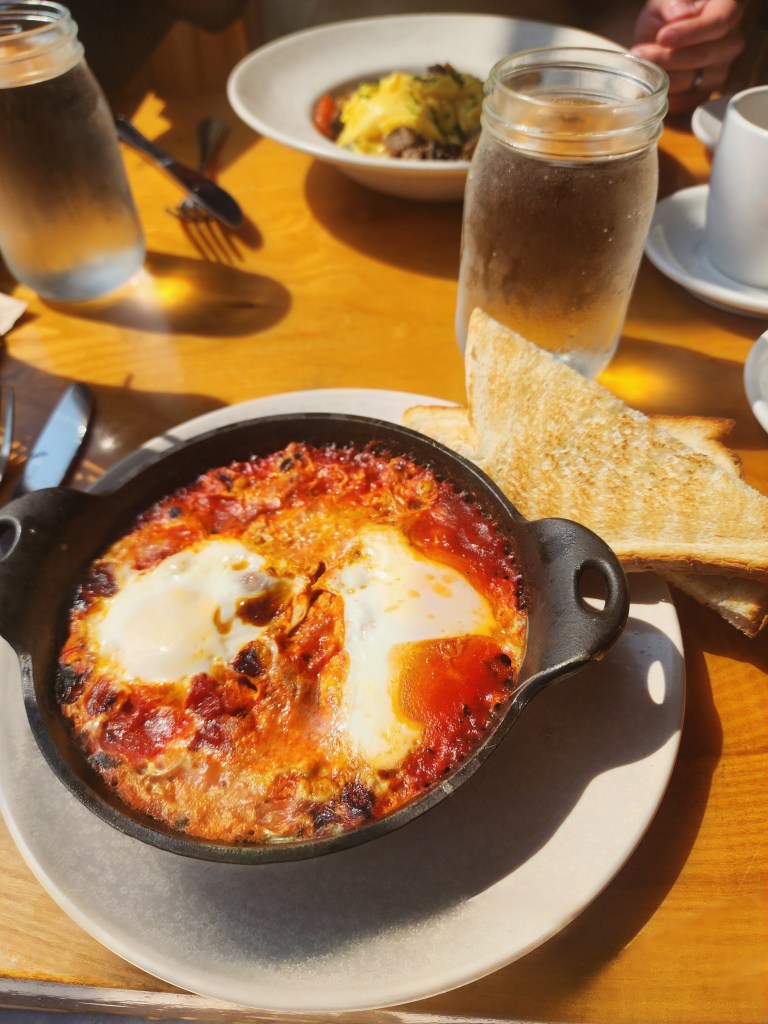For picturesque views of the harbor and enclosed patio seating, try Harborside 1901 grill. A bit more upscale, we went here without the kids. We had a delicious brunch date overlooking the footbridge. Food was well seasoned with some interesting options like shakshuka, pictured below. They also serve lunch and dinner. https://harborside1901.com/