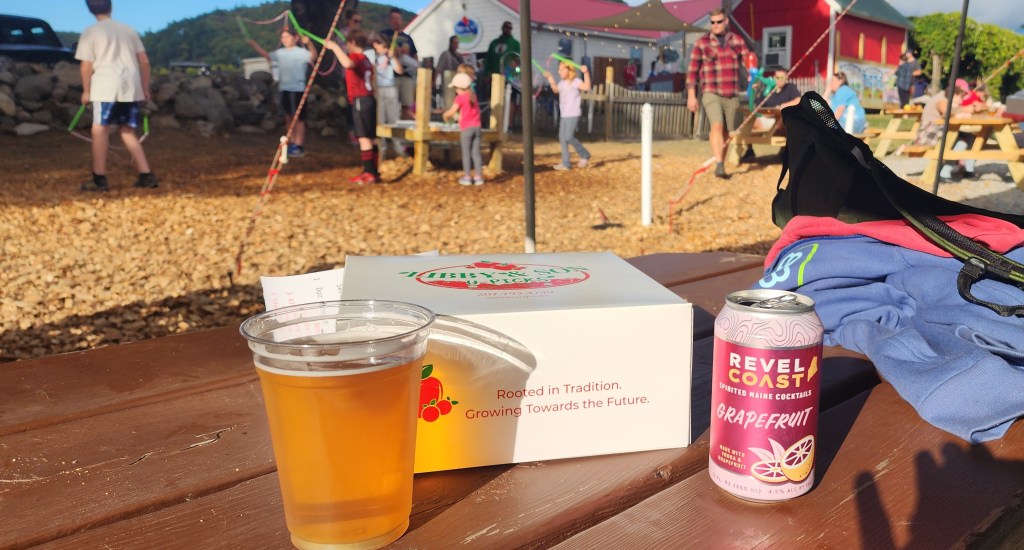 1:00 – Sit at a picnic table and drink a beverage. Meanwhile, kids can keep busy playing corn hole, yard Connect 4, stacking wood blocks, giant bubbles. They also can climb on some tractors.