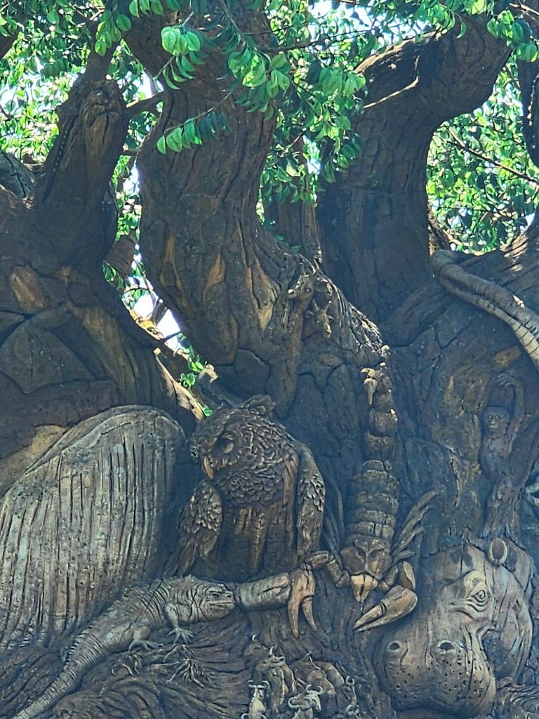Disney World’s Animal Kingdom was probably my favorite park that we visited during our trip in early Spring. Upon entering, you quickly come to the Tree of Life. A giant, unique, intricately carved centerpiece made to resemble a giant baobab tree. The details are stunning and the more you look, the more animals you find carved into the trunk.