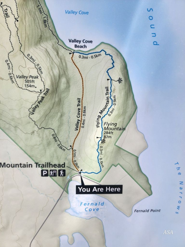 Start by turning off Route 102 onto Fernald Point Road. It is a small bumpy road, but will bring you to the small parking lot for Flying Mountain.